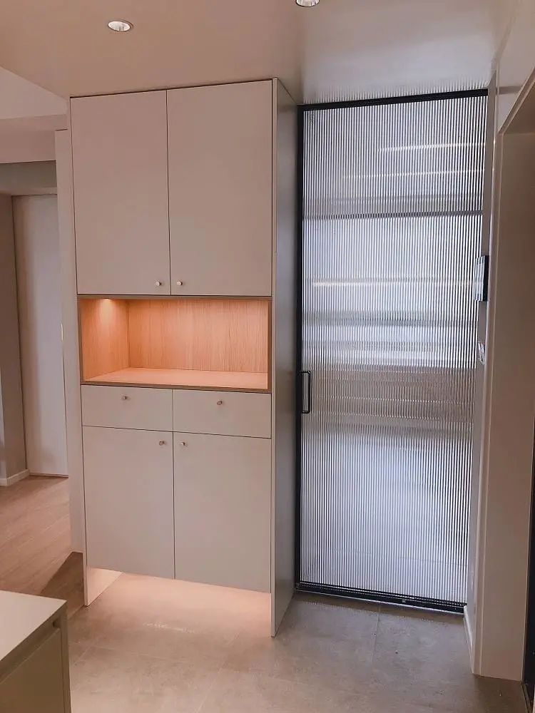 与鞋柜紧邻的是一道长虹玻璃推拉门,透光不透视,隔断玄关与衣帽间。
