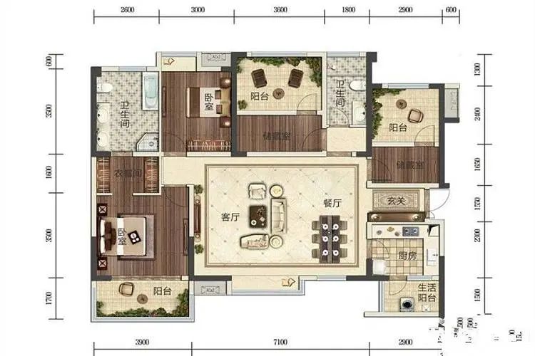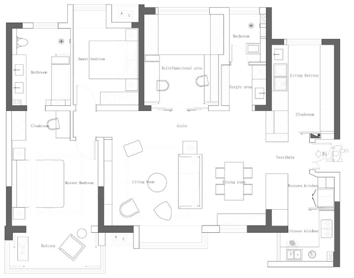 装修布置图,结合屋主生活习惯和需求,把原有阳台打通纳入室内,扩大使用面积。同时拆除客厅与储物间隔墙,打造成多功能房。