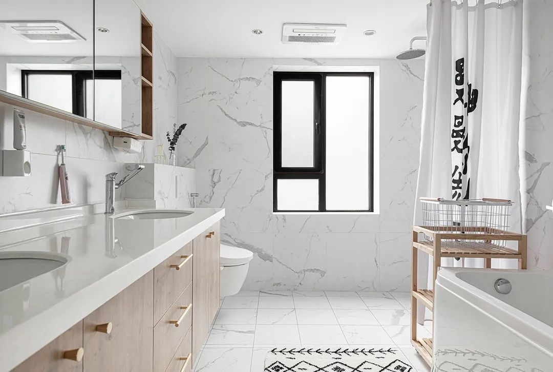 主卧卫生间,以白色瓷砖突显明亮,辅佐木色实现冷暖呼应,让整个空间变得柔和许多。两个卫生间淋浴均采用浴帘,灵活空间宽敞,也减少了清洁玻璃的麻烦。金色浴室柜拉手和壁龛瓷砖变化,简单精致。浴缸和淋浴结合,不需要再为选择那个而烦恼。