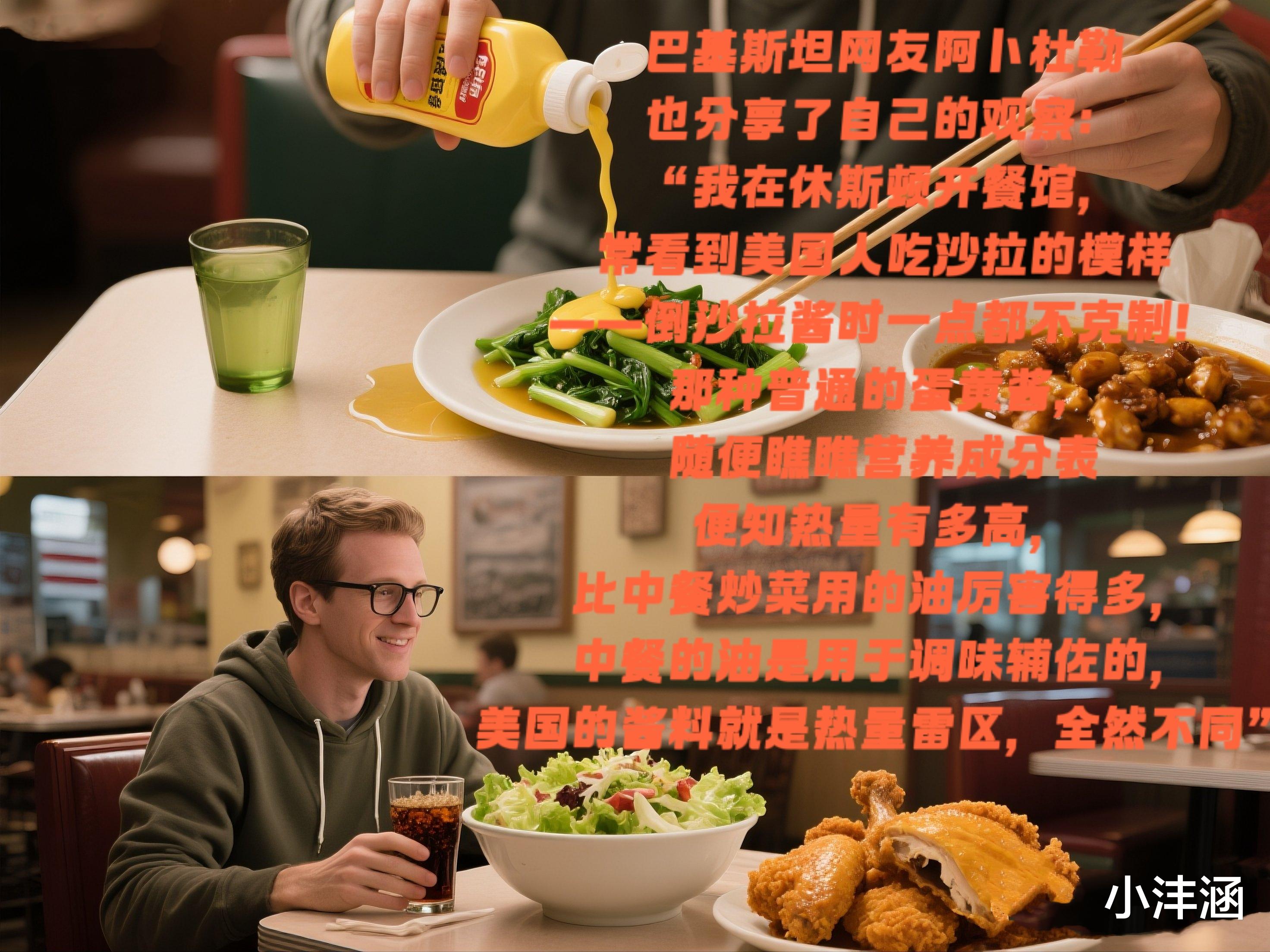 巴基斯坦网友阿卜杜勒也分享了自己的观察:“我在休斯顿开餐馆,常看到美国人吃沙拉的模样——倒沙拉酱时一点都不克制!那种普通的蛋黄酱,随便瞧瞧营养成分表便知热量有多高,比中餐炒菜用的油厉害得多,中餐的油是用于调味辅佐的,美国的酱料就是热量雷区,全然不同,”