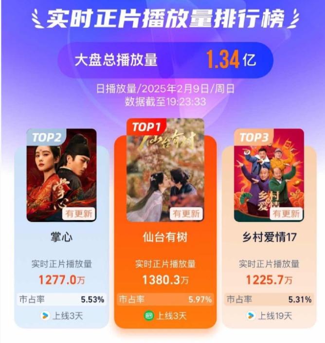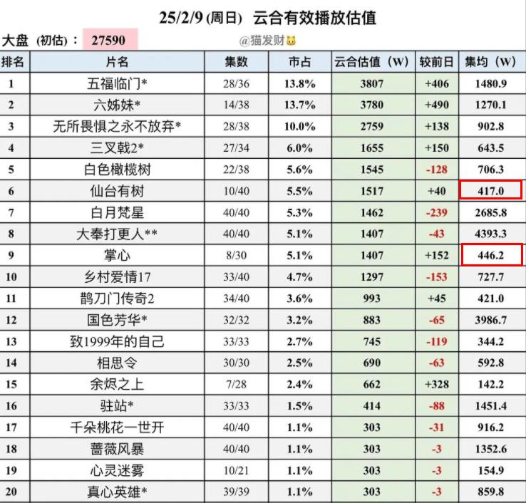 近期,我们可以发现,两部剧同期对打之后,总会有一部剧成功脱颖而出,但《仙台有树》和《掌心》对打,这两部剧的热度和关注度始终上不去,《仙台有树》的实时正片播放量为1380.3万,《掌心》的实时正片播放量为1277万。