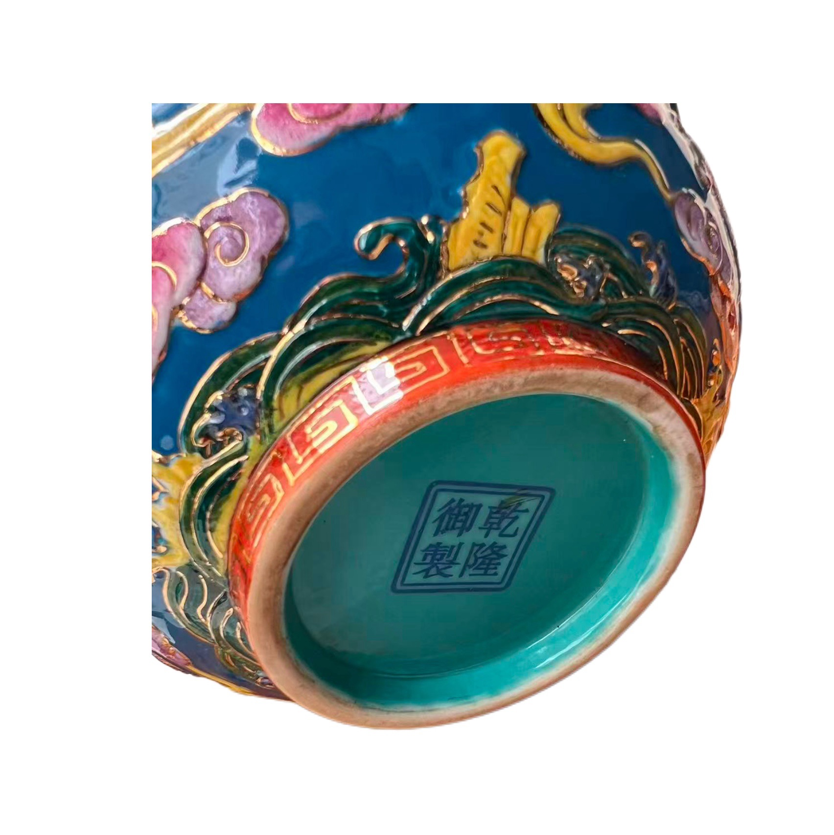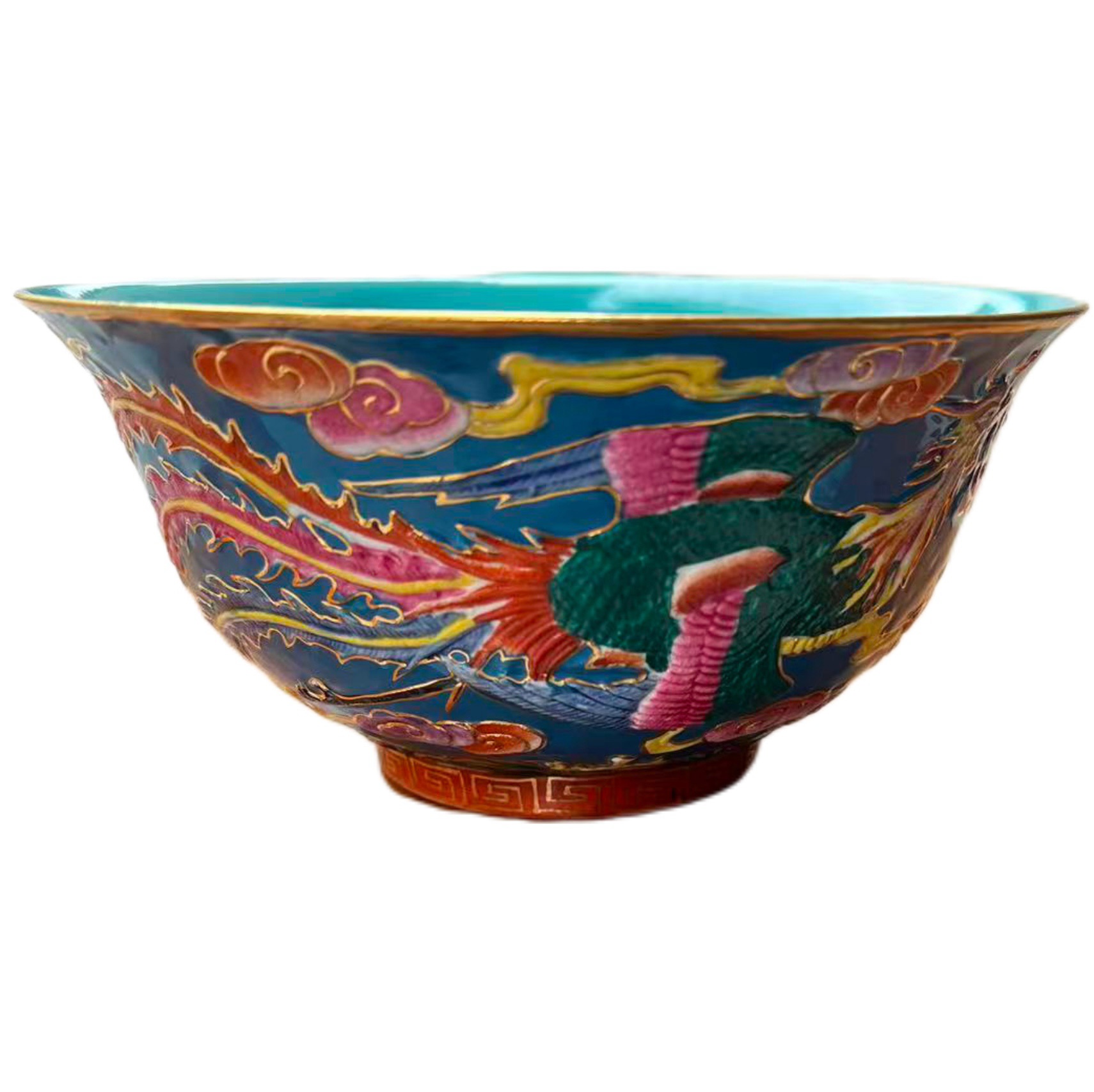 (二)珐琅彩施釉:色彩艺术的巅峰展现碗身的珐琅彩施釉工艺,是其工艺价值的核心亮点之一。所采用的珐琅彩釉料,色彩丰富且极为艳丽,蓝色底色深邃神秘,仿佛蕴藏着无尽的夜空奥秘;红色龙纹热烈奔放,似能感受到皇家权威的蓬勃力量;绿色、粉色等其他色彩相互搭配,和谐却又层次分明,宛如大自然中最绚丽的调色盘。