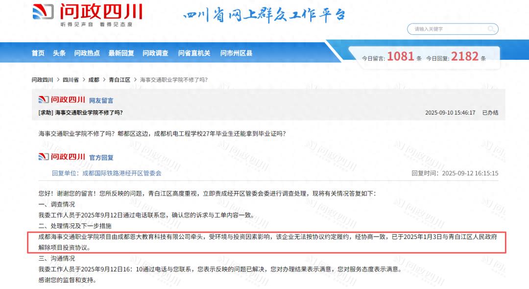 9月12日,成都国际铁路港经开区管委会在“问政四川”回复称:成都海事交通职业学院项目由成都恩大教育科技有限公司牵头,受环境与投资因素影响,该企业无法按协议约定履约,经协商一致,已于2025年1月3日与青白江区人民政府解除项目投资协议。