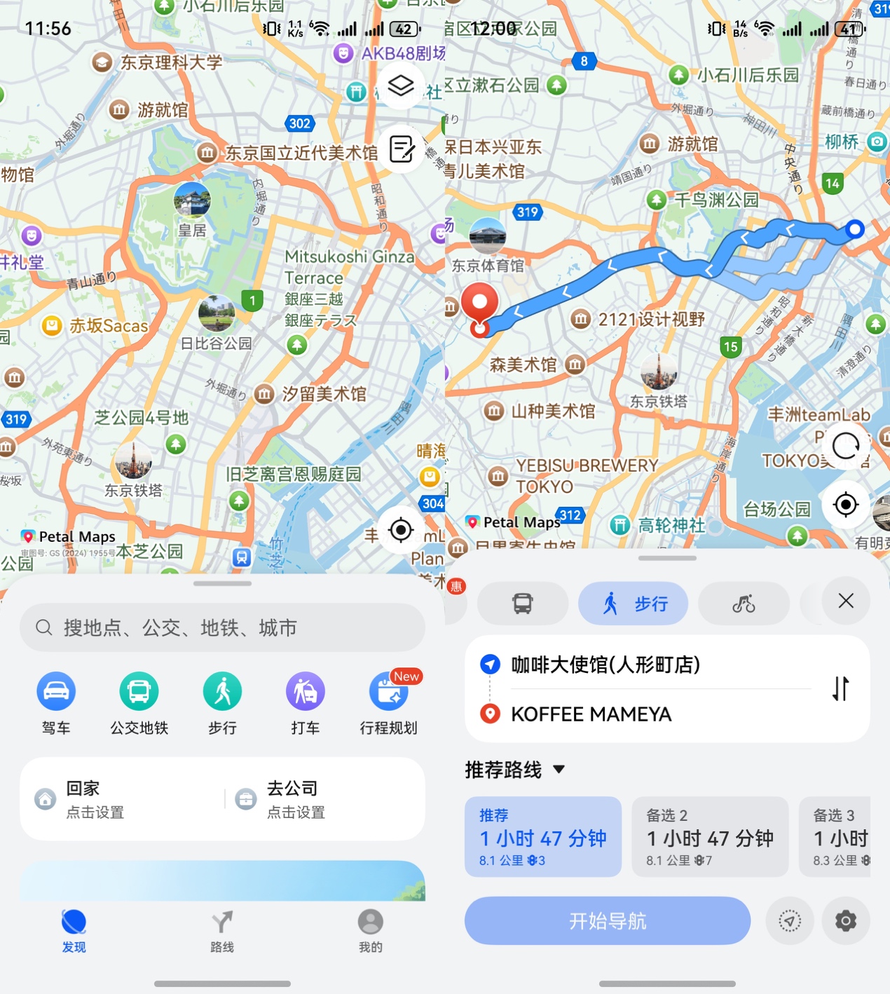 再来聊聊让我摆脱“路盲”标签的花瓣地图。出发前,我在小红书上收藏了不少小众好店,比如东京银座附近的小众咖啡馆、大阪心斋桥的设计师买手店。到了附近直接在花瓣地图里输入店铺名,定位准得没话说。最贴心的是,它还支持全中文界面和中文语音导航,我只需要跟着语音走,完全不用对着日文路牌犯愁。要是有华为手表,还能将导航流转到手表上,抬手就能查看路线。