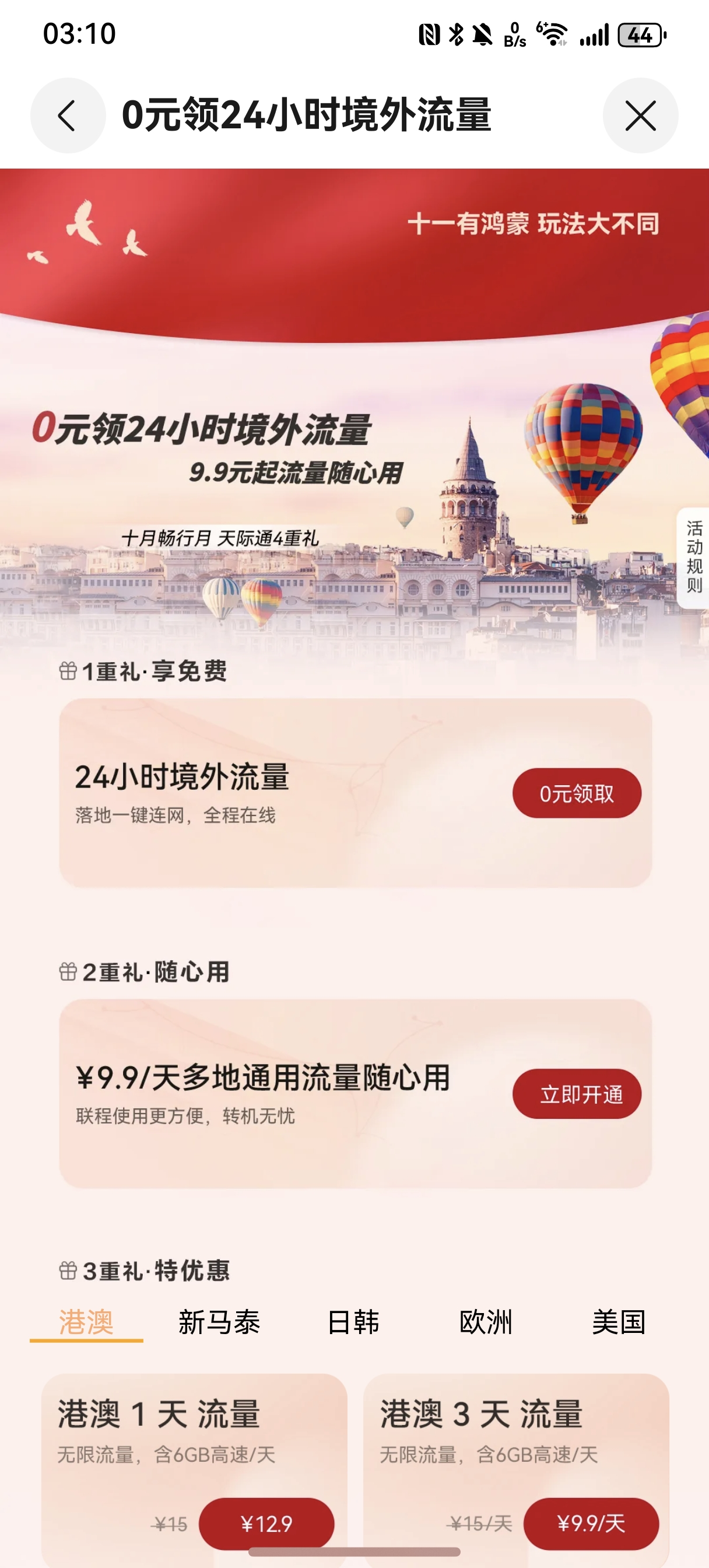 先说说最让我担心的网络问题。之前总听朋友吐槽,在国外换电话卡很麻烦,开通国际漫游又贵得肉疼。这次出发前,我正好刷到天际通的“十月畅行月”活动,发现可以领免费的24小时境外流量,据说有效期有10个月之久,但我飞机刚落地成田机场就立刻用了,手机马上就连上了网络,真的好用。整个行程中不管是发朋友圈、刷景点攻略视频、在线导航,还是和家人用视频报平安,网络都没有半点卡顿,彻底治好了我的“没网焦虑“。