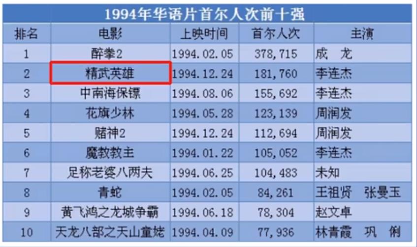 另外在台湾新加坡,《赌神2》也是仅次于《醉拳2》的话语片票房榜,可以说精武英雄,在大部分市场是输给了《醉拳2》,不过好在李连杰的韩国粉丝够铁,让《精武英雄》拿下了1994年韩国市场华语片,票房榜的第二名,超过《赌神2》,仅次于那一年的王者《醉拳2》