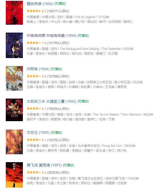 当然一部影片的经典与否,并不一定需要靠票房来印证,李连杰职业生涯中拍过四五十部电影,票房高的有很多,但是在豆瓣口碑最好的就是《精武英雄》