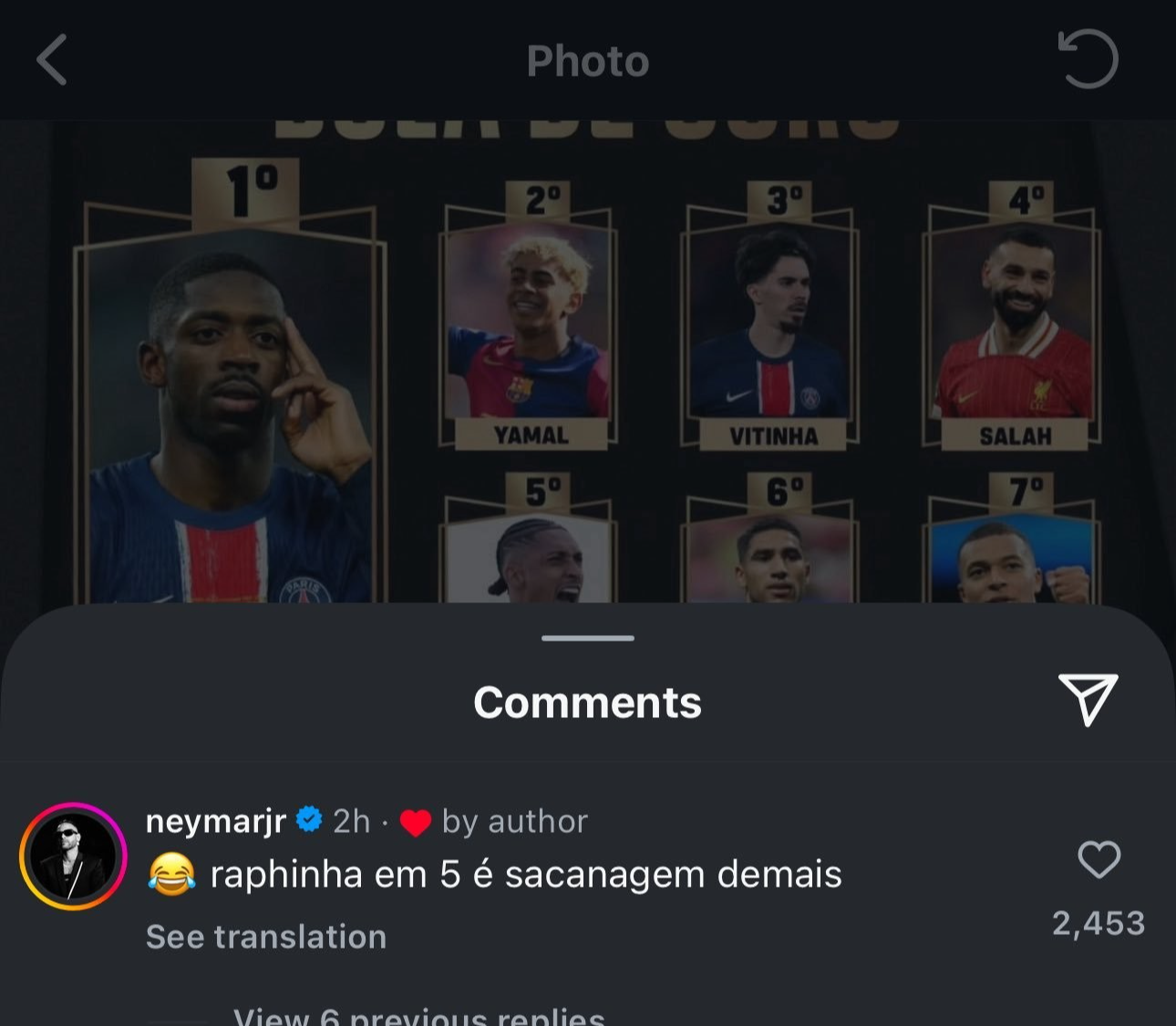 在回复社交媒体Instagram上的一条帖子时,内马尔评论道:“拉菲尼亚排第五,简直太离谱了。”