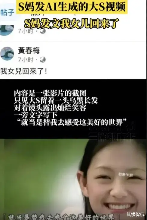 总是独家爆料的徐家的台湾某媒体又再度出手了!3月19日,S妈在凌晨时分于社交平台发布了一段AI生成的大S视频,配文写道“我女儿回来了”。这一举动迅速引发了网友们的关注,独家台媒也借此机会对汪小菲进行了新一轮的抨击。