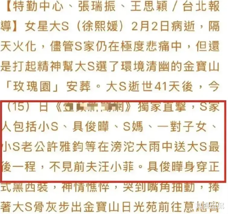 由此可知,这无疑是独家媒体能够得到S家回应的佐证。隔三差五捧具俊晔,抨击汪小菲的舆论愈演愈烈。更离谱的是,在大S下葬当天,这家媒体还特别报道,称大S的两个孩子也曾前往墓地,陪同徐家人,而汪小菲却缺席,引起了广泛讨论。