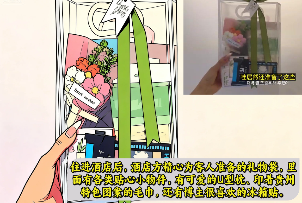 礼物袋中装着各类贴心小物件,有可爱的U型枕、印着贵州特色图案的毛巾,还有她一直心仪的冰箱贴,小姐姐开心地表示,她每去一处地方旅行,都会买冰箱贴作纪念,这份礼物很不错。