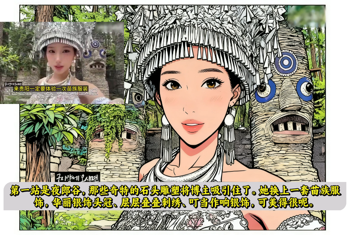 当然美丽是有代价的,身着此装于景区漫步,回头率堪称百分百,可称为景区内最靓的韩国小姐姐。这个地方最具传奇色彩的是夜郎谷的建造故事,导游向她讲述,眼前这个大石头王国是一位艺术家耗时整整20年亲手一点点构建而成的家,小姐姐听闻后十分敬重。离开神奇的夜郎谷之后,她抵达了有名的青岩古镇,古镇入口处,国家5A级旅游景区的标识牌十分醒目,这表明是中国旅游景区的最高认证。踏入古镇,仿佛瞬间穿越时空,青石板路与古朴建筑,构成一幅流动的历史画卷。午饭时分已至,导游领着她们去品尝当地最知名的卤猪蹄,那盘猪蹄色泽红亮,端上桌时,所有人都被香味所吸引,这位小姐姐连忙吃上了,这猪蹄又软又烂还很入味,一吃就化在嘴里,她不停夸赞,真是好吃得不得了。