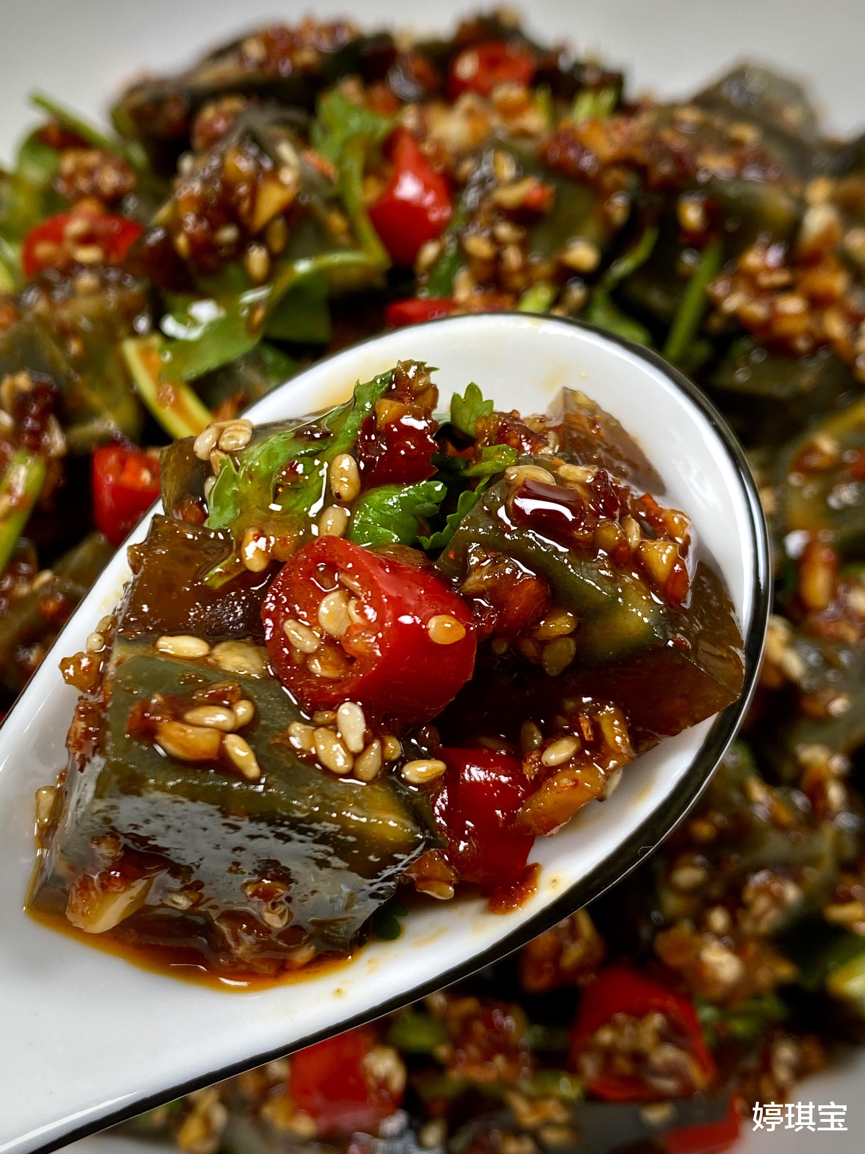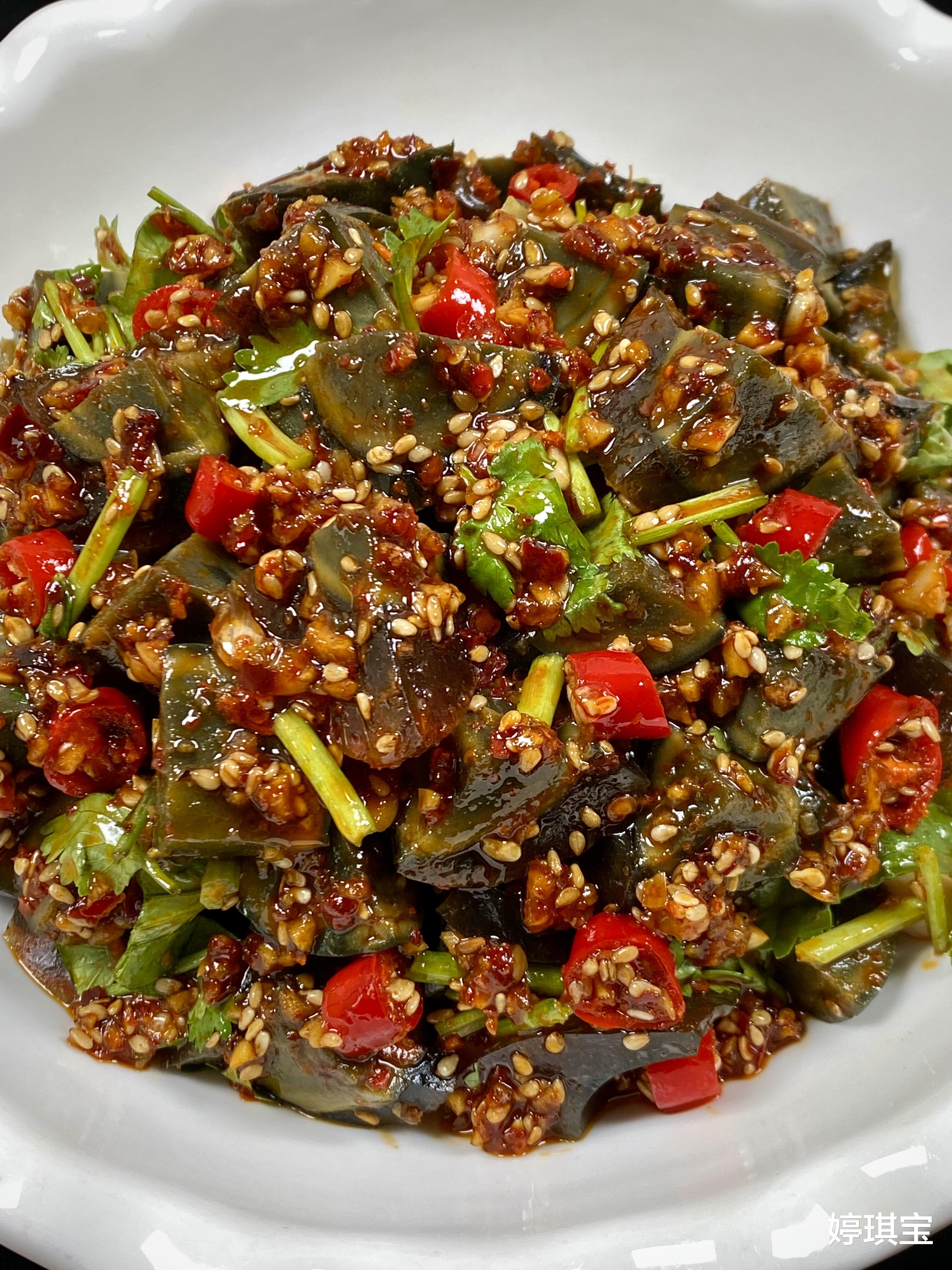 香菜铺底,摆上皮蛋,淋上酱汁。看!墨玉般的皮蛋,翠绿的香菜,鲜红的辣油,宛如一幅写意水墨画~