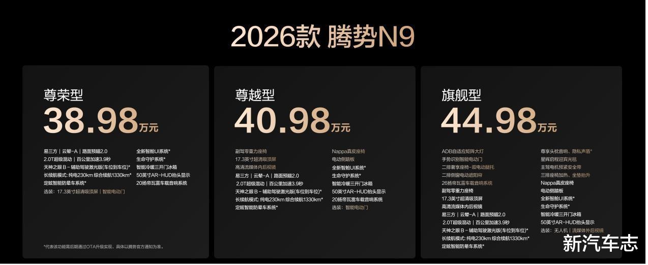 2026款腾势N9正式上市,推出三款配置,售价38.98万元起