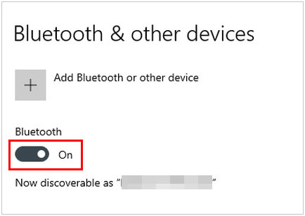 在您的电脑上,转到“开始”>“设置”>“设备”>“蓝牙和其他设备”,并确保“蓝牙”已打开。