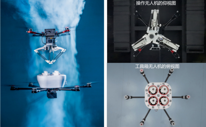 赵世钰对 DeepTech 解释说道:“这里机械臂的作用是将工具‘拿’出来或者‘放’回去。我们还可以引入更多无人机,这种工具箱的作用类似于空中航母或空中加油机。它可在空中悬停,然后不同的无人机可按序飞来选取不同的工具,来完成长序列、多场景的复杂的任务。”