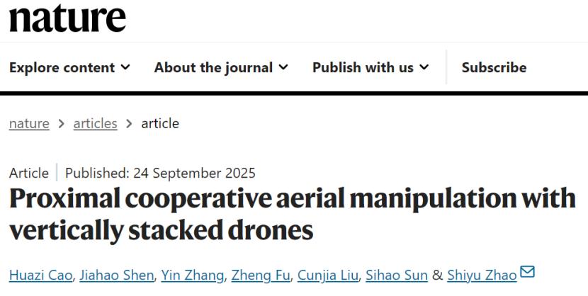 1.Cao, H., Shen, J., Zhang, Y., Fu,Z., Liu,C., Sun,S., Zhao,S. Proximal cooperative aerial manipulation with vertically stacked drones. Nature (2025). https://doi.org/10.1038/s41586-025-09575-x