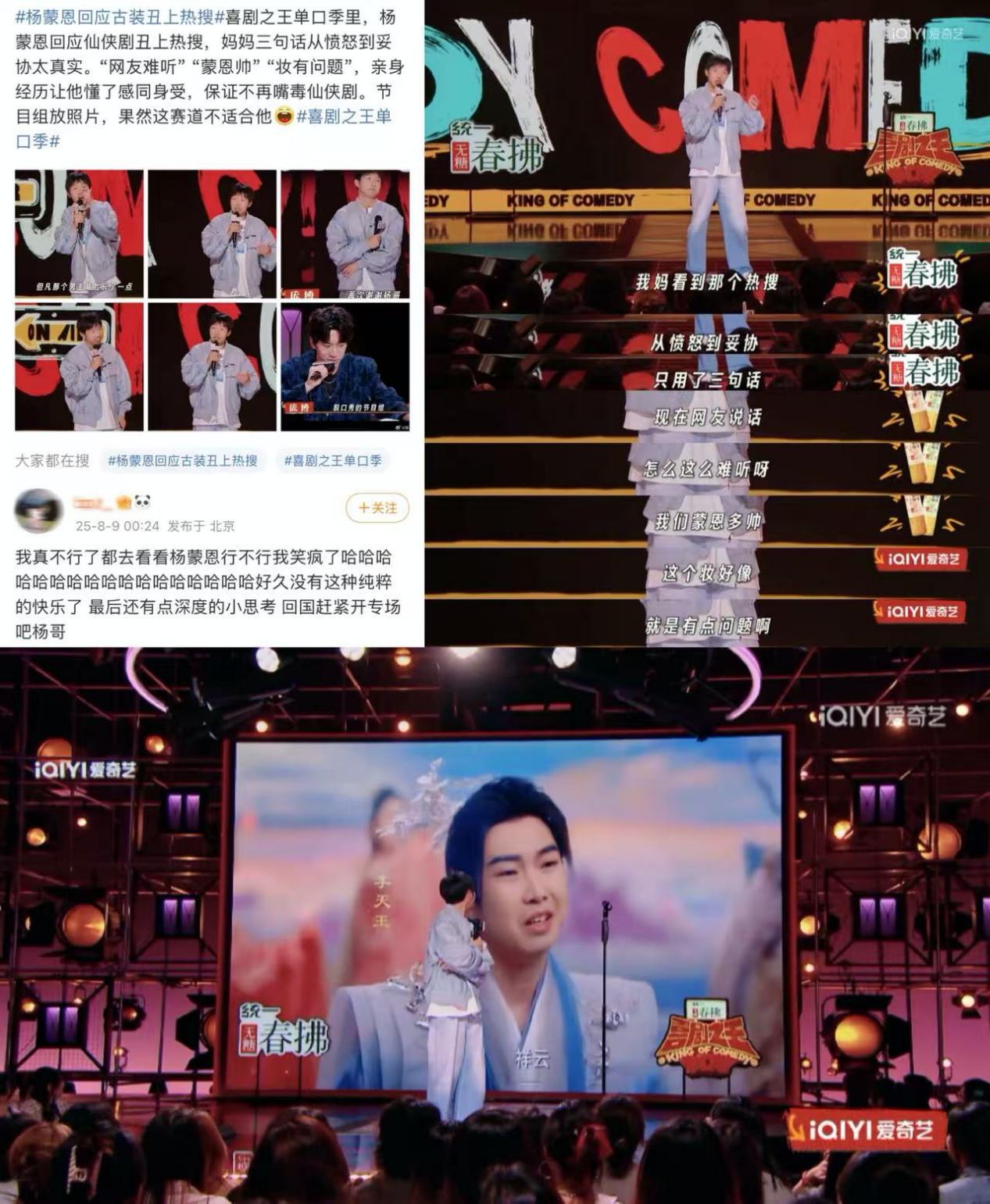 杨蒙恩和大家分享了自己拍摄仙侠剧的经历,聊到剧曾上过一个热搜叫“才发现杨蒙恩这么难看”后,他用独到的视角解读“难看和丑”的区别:“古代唱戏有生旦净末丑、有丑角,但没有难看角,因为难看的成不了角!”逗得观众笑翻了,看得出来他的小心灵真的有被伤到。甚至连自己的妈妈都被“狠狠击碎了”,从愤怒到妥协只经历三句话的时间:“网友说话怎么这么难听?”“我们蒙恩多帅啊”“这个妆好像是有点问题”,不过没被击穿的是杨蒙恩的大姨,主打一个力挺到底。最好笑的是节目组最后贴脸开大放出了那张照片,《喜单2》你就这么对你的演员吧,我们爱看