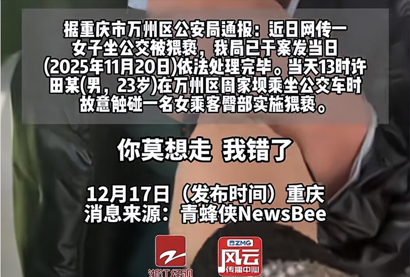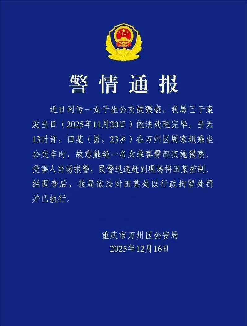 到了12月16号,重庆万州公安发了通报,确认田某的猥亵行为是真的,依法给了他行政拘留的处罚,现在这个处罚已经执行完了。