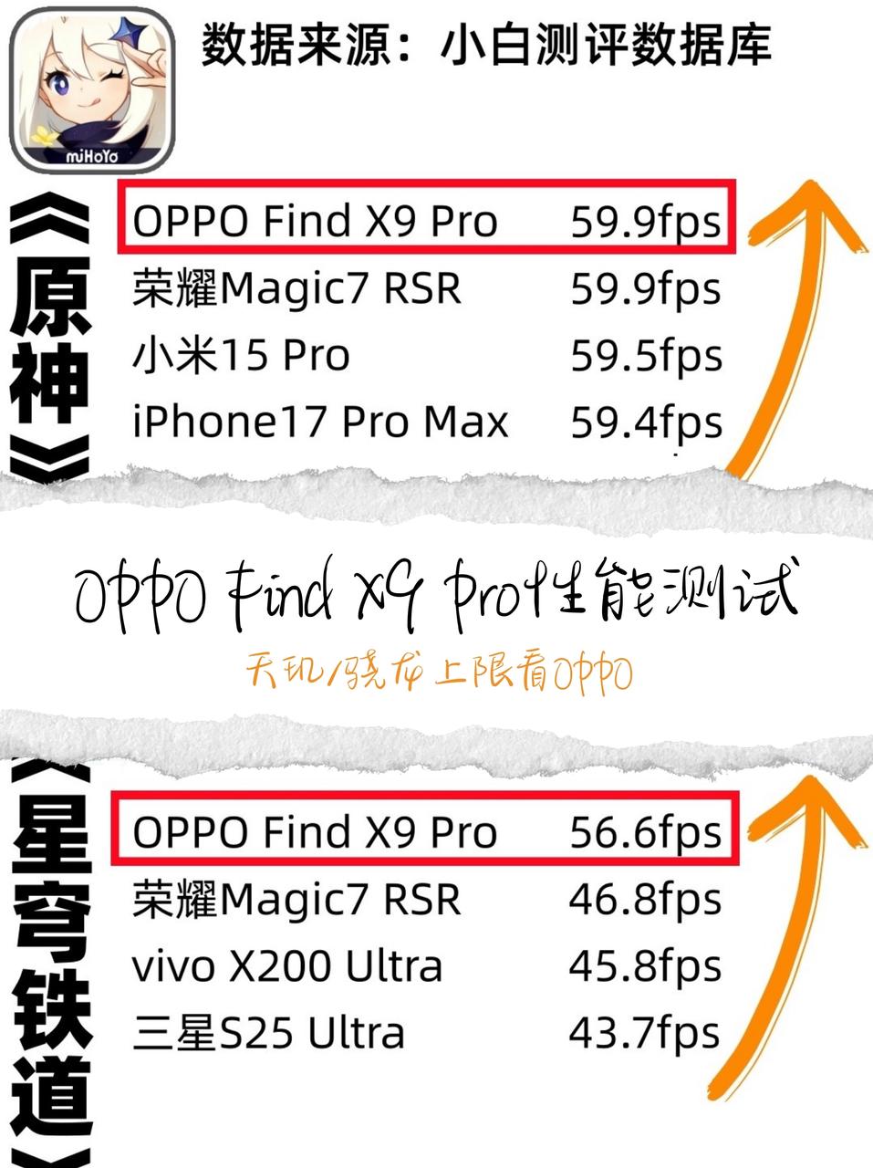 还有玩游戏也是日常常见的高负载场景,ColorOS 16全新的潮汐引擎就是为解锁天玑/骁龙芯片上限而生。拿最近新鲜出炉的OPPO Find X9 Pro游戏测试来说,无论是原神,还是崩铁,它的平均帧率都要比其它旗舰要高,接近满帧,比iPhone 17 Pro Max还要流畅。