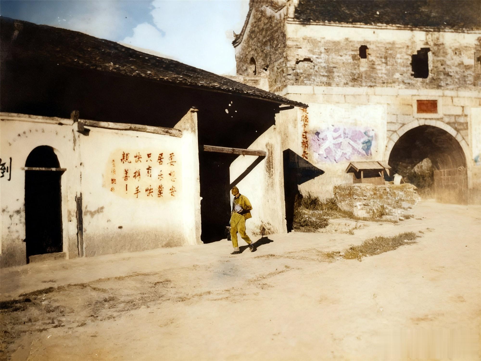 通城北门前外的景象,城门两侧画着亲日宣传壁画,壁画下有日军设立的岗亭,岗亭旁边围着一圈矮墙作为防御工事。路边民居的墙壁上,刷着汉奸标语:要想安居乐业,只有快快携手亲善。