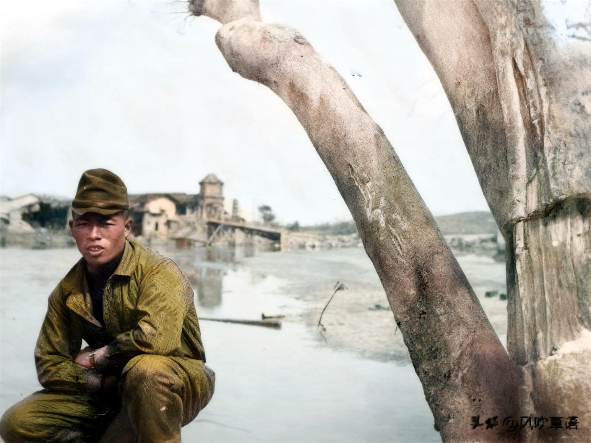 蹲在隽水河边老树下照相的鬼子兵再次出镜,此时身后的背景换成了中国守军遗留下的地堡。鬼子歪戴着军帽,穿着趿拉板,活脱脱的一副二流子的模样。