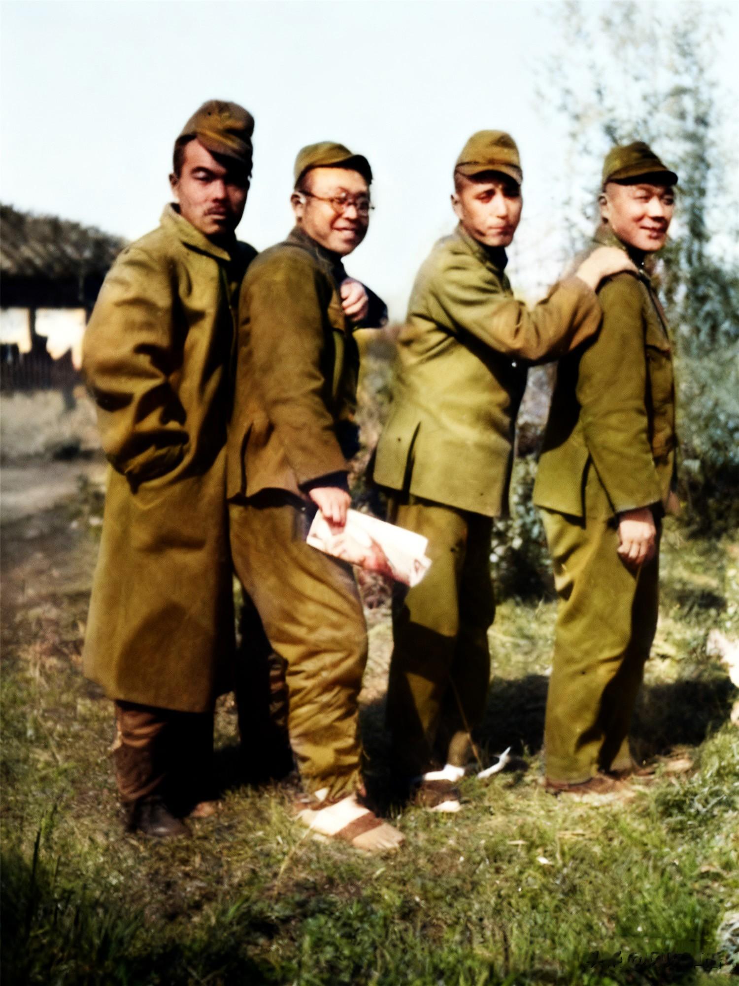 四个日本兵排成一列,侧身对着镜头,其中一个戴眼镜的家伙手里还拿着一本画报,神情中透着得意,看着令人生厌。