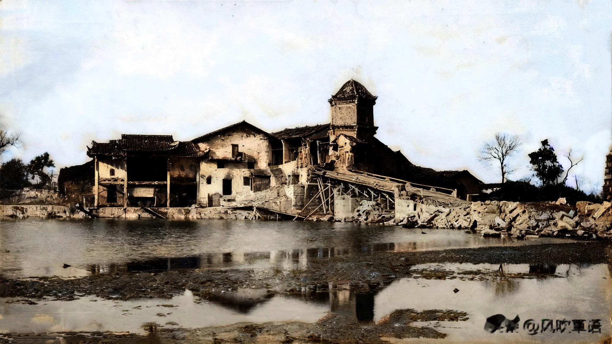 通城城外的隽水河。隽水河是通城的母亲河,养育了一代又一代的通城人。此时的隽水河,成了侵华日军钓鱼休闲的地方。在宽阔的河面上,还有一座高架木桥。河面部分的桥面已完全被摧毁。