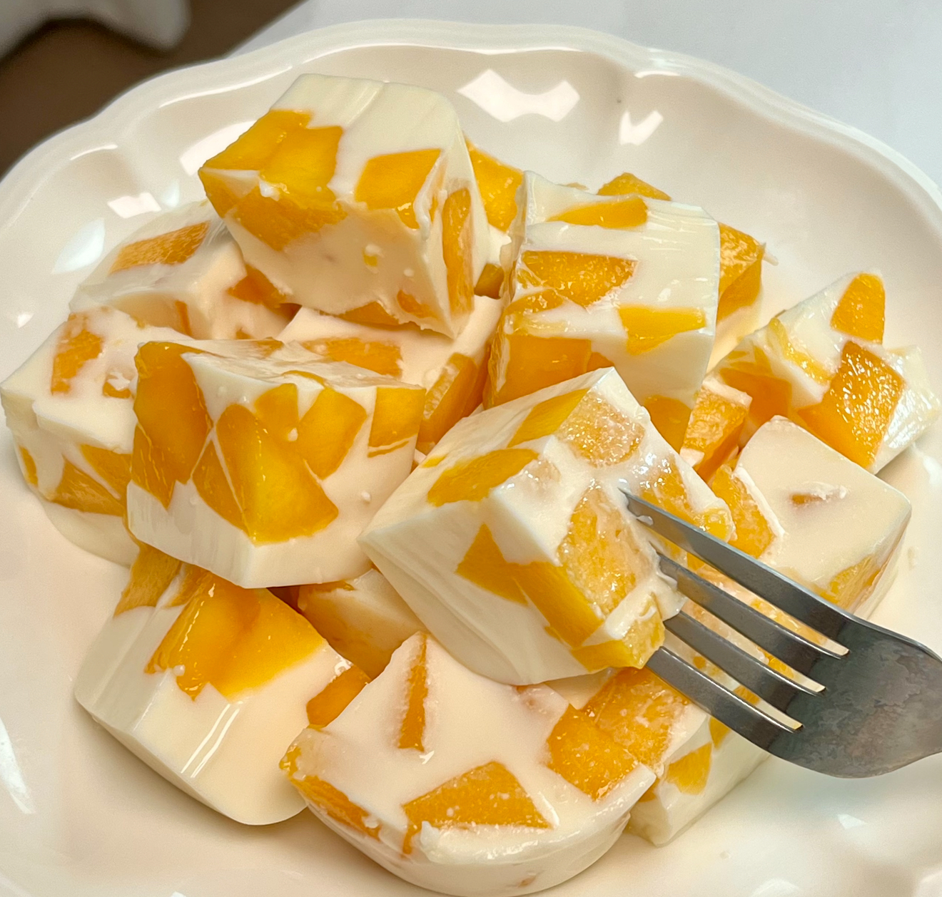 第五步,组装。等椰奶稍微凉一点,不那么烫手了,就把切好的芒果块均匀地撒在椰奶里。看着芒果块在椰奶里“游泳”,就像一群金色的小鱼在白色的海洋里嬉戏,超可爱!