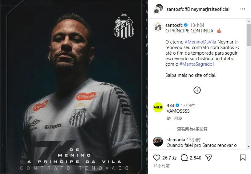官方:桑托斯宣布和内马尔续约到赛季结束(12月底)。