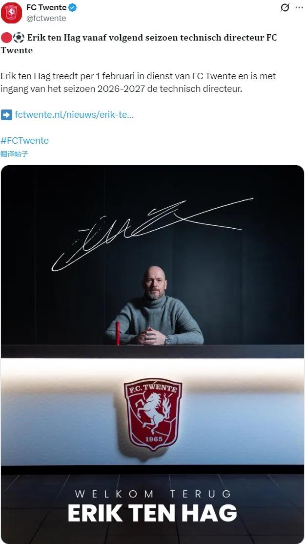 官方:前曼联主帅滕哈格被任命为了特温特队的技术总监。