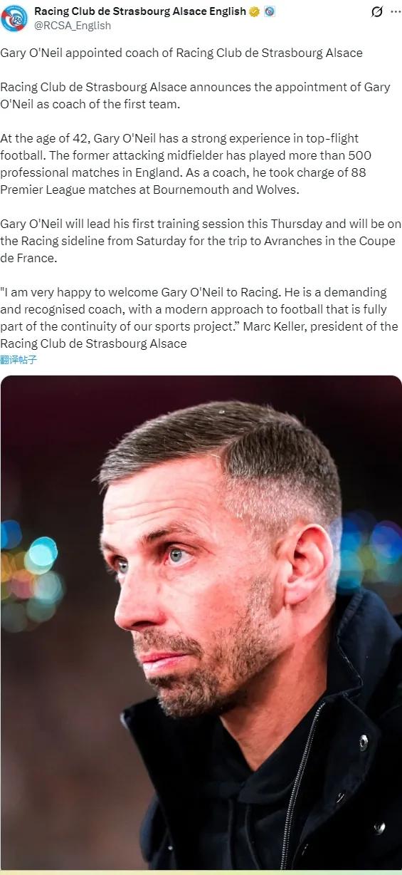 官方:斯特拉斯堡宣布任命加里-奥尼尔为俱乐部新主帅。