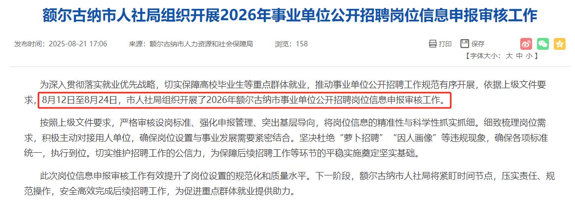 最新消息传来!额尔古纳市人社局已在8月12日至8月24日紧锣密鼓地组织开展了2026年事业单位公开招聘岗位信息申报审核工作。