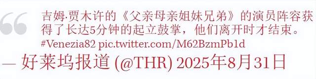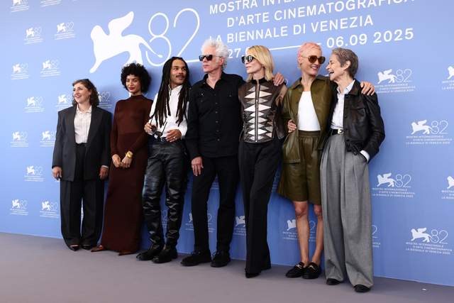 在威尼斯电影节上首映的吉姆·贾木许的《父亲母亲姐妹兄弟》获得了热烈的5分钟起立鼓掌。以下是包括凯特·布兰切特、夏洛特·兰普林、梅梅·比尔克、维琪·克里普斯、卢卡·萨巴特和印迪亚·穆尔在内的演员们享受这一时刻。