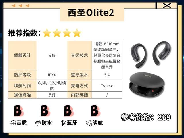 西圣Olite2配备了蓝牙5.4soc芯片,传输速度快,连接稳定,延迟还低,同时佩戴稳固舒适。总体来说,西圣Olite2开放式无线蓝牙耳机是一款百元价格的宝藏耳机,在设计、音质、技术、舒适度各方面都表现出色,性价比超高。如果你也在找一款音质好、舒适度高、性价比又不错的耳机,西圣Olite2真的值得一试。要提醒的是,遇水后要及时擦干,以提高耳机寿命。