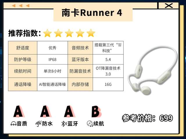 音质方面,Runner4采用南卡旗舰级高性能骨传导振子,结合OT闭合防漏音技术3.0,有效减少漏音,同时进一步优化低频质感,使声音更加饱满、自然。骨传导耳机独特的开放式聆听体验,让你在运动时既能沉浸在音乐中,又能感知周围环境音,提升运动安全性。与同价位产品相比,Runner4的音质表现已接近千元级耳机,真正实现“百元享受千元听感”!