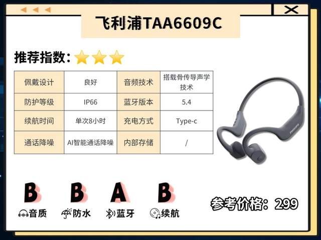 飞利浦TAA6609C作为一款高端骨传导耳机,采用了先进的骨传导技术,能够有效传递声音而不遮挡耳道,保持外界环境的感知。这款耳机的设计也非常适合运动,挂耳式的设计确保在剧烈运动中也能稳固佩戴。它的续航能力表现出色,单次充电可使用长达8小时,适合长时间的户外活动。此外,TAA6609C还具备高端降噪功能,能够有效过滤环境噪音,让用户在嘈杂的环境中依然能够享受清晰的音质。飞利浦TAA6609C在高端降噪、续航和佩戴稳定性上表现优异,适合追求高品质音效和长时间使用的用户。