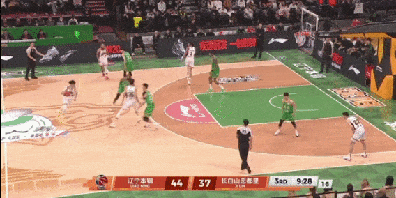摩尔借助中锋挡拆后向篮下突破,吸引中路防守后分球给偷溜篮下的栾利程,后者完成单手劈扣,