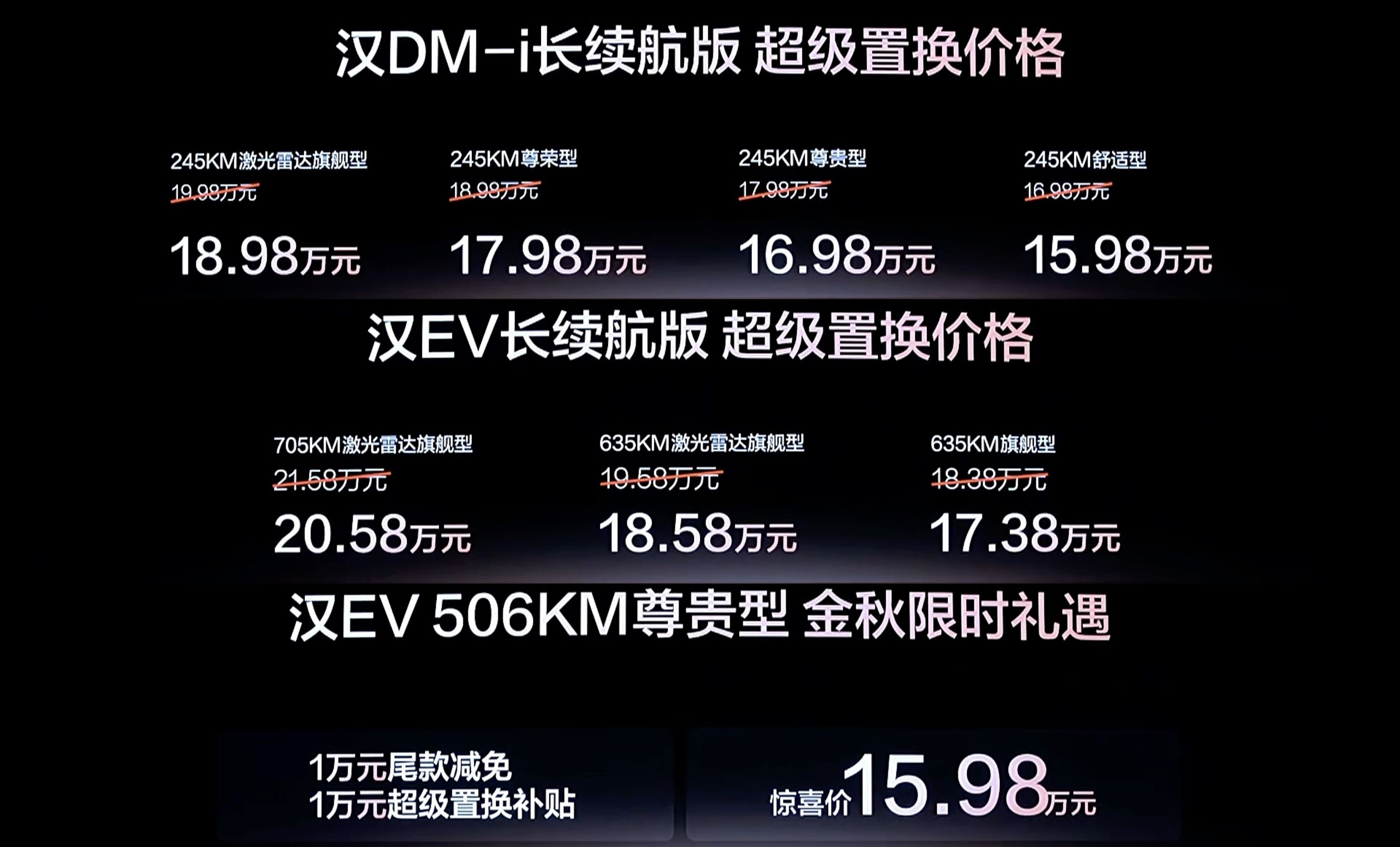 10 月 11 日,比亚迪汉长续航版迎来正式上市,雷科技/电车通受邀参加线上报道。其中,汉 DM-i 长续航版共推出四个版本,售价区间为 16.98~19.98 万元,汉 EV 长续航版共推出三个版本,售价区间为 18.38~21.58 万元,这些车型均提供 1 万元的置换优惠。此外,官方还针对汉 EV 560KM 尊贵型给出 15.98 万元的限时优惠价。