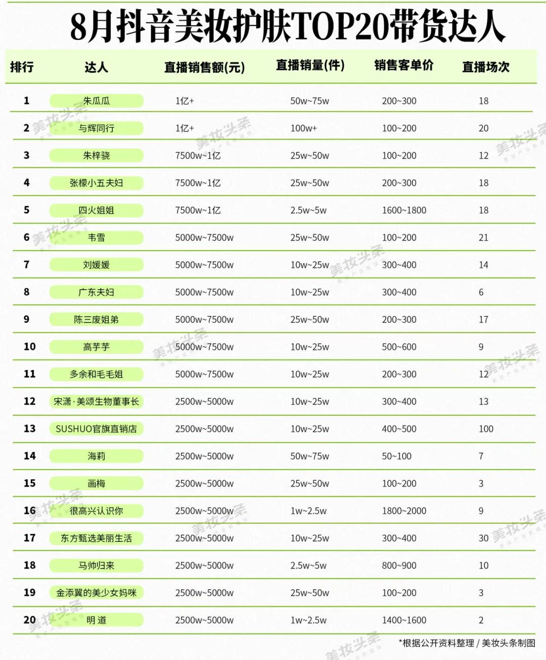 不同于上月仅有3个头部达人直播销售额超7500W元,8月,抖音美妆带货的头部效应进一步加剧,直播销售额破7500W元的达人阵营扩容至5个,其中“朱瓜瓜”和“与辉同行”当月销售额突破1亿+元。