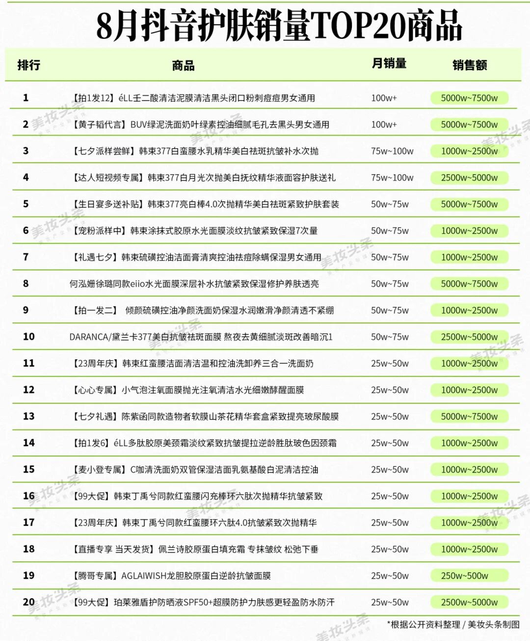 8月抖音美妆护肤商品榜单同样迎来新格局。