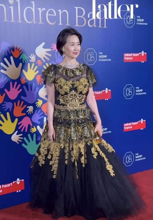 一身黑色长裙,将她恰到好处的身材展现无余,显得大方得体。仔细看来,那张脸仍然有她年轻时的风采。