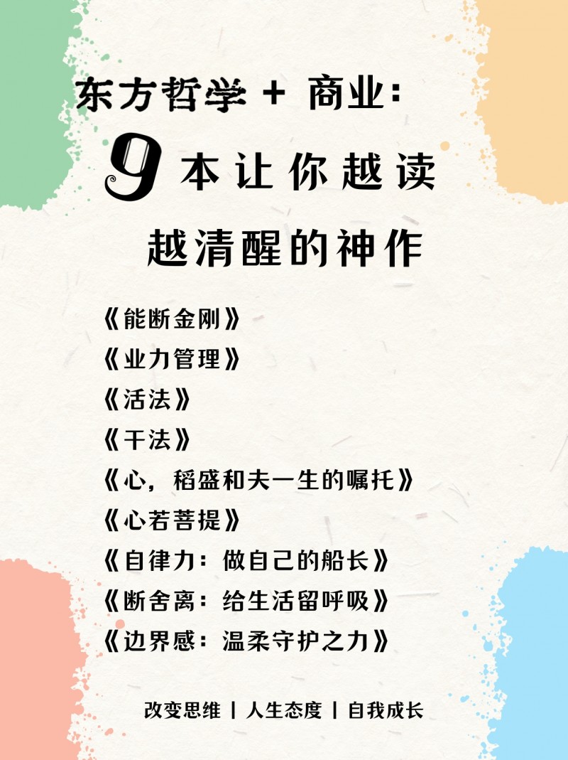 9本书共同证明:东方哲学智慧并非脱离现实的玄学,而是可融入商业决策与日常人生的实践指南。从 “业力管理” 的商业策略到 “断舍离” 的生活哲学,从 “利他之心” 的经营理念到 “自律” 的自我要求,最终都指向 “通过外在实践净化内心,实现事业与人生的通透自在”。