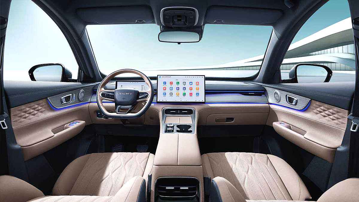 瑞虎8 PLUS的内饰采用环抱式设计,配备15.6英寸2.5K高清屏与12.3英寸双联屏。,主驾座椅搭载4向腰部支撑功能,副驾座椅则支持腿托调节功能,同时前排座椅均支持加热通风,带来更优质的用车体验。