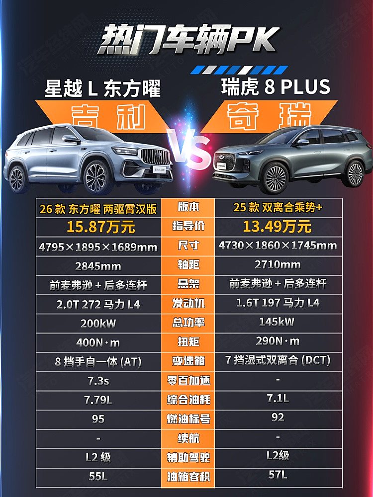 奇瑞瑞虎8 PLUS 2025款290TGDI DCT乘势+售价为13.49万元,吉利星越L 2026款东方曜2.0TD自动霄汉版售价为15.87万元,两款车均为纯燃油车,均在9月份上市,都面向家庭用户,那么哪一款车更值得入手呢?