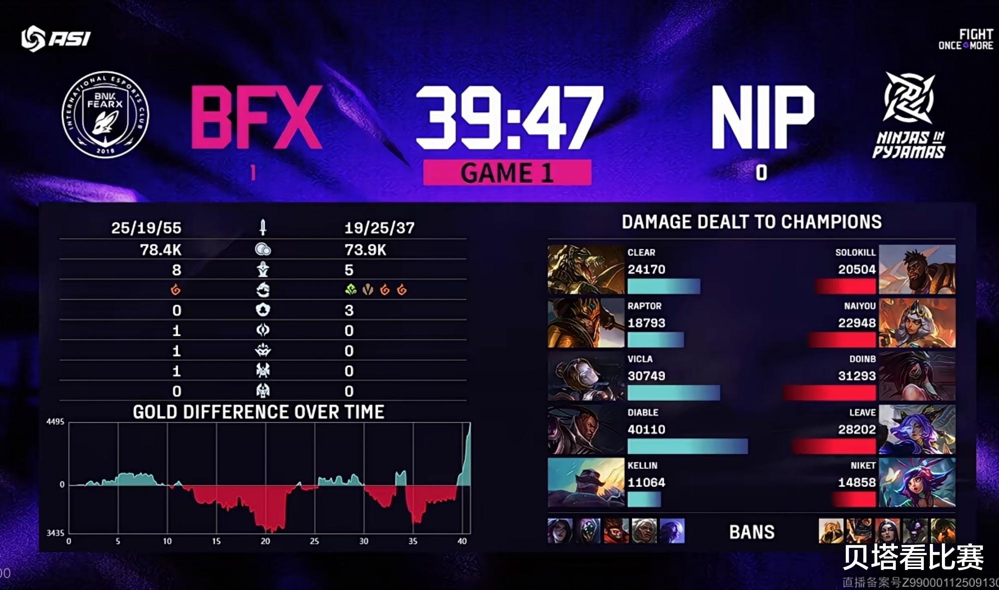 中期双方混战,BFX皇子拉扯成功,配合队友击杀leave芸阿娜,之后BFX主动打厄塔汗,doinb阿卡丽进场切死FPX皇子,naiyou琪亚娜失误,FPX反打打出1换4后,拿下厄塔汗。22分钟NIP拿下听牌龙。后期31分钟BFX在野区抓死NIP上辅2人后,拿下第一条大龙。33分钟双方争夺小龙,Niket妮蔻绕后R多人,NIP打出0换3后,拿下火龙魂。38分钟双方野区混战,Niket妮蔻绕后被抓,Leave芸阿娜被秒,BFX卢锡安豪取3杀,直接一波推平基地。首局伤害最高的Diable卢锡安,NIP这边伤害最高的是doinb阿卡丽。
