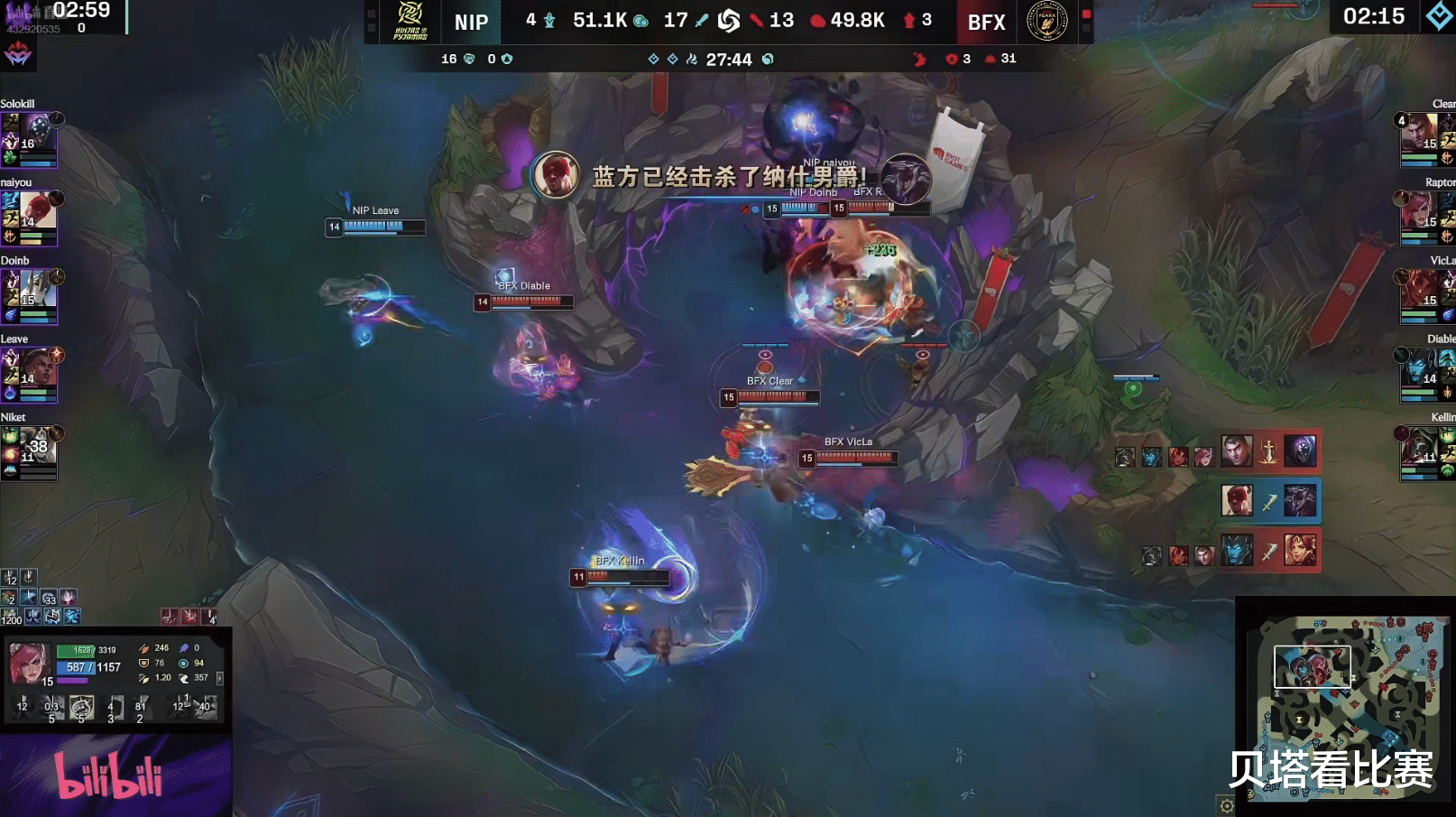 中期NIP下路双人组又被击杀,BFX拿下厄塔汗。24分钟双方下路混战,NIP利用人多打人少5V4打出0换4后,拿下听牌龙。27分钟NIP主动打大龙,虽然naiyou盲僧拿下第一条大龙,但是因为打龙太慢,BFX赶来堵住龙坑打出完美团,一波0换5团灭NIP后,拿下第二局的胜利。