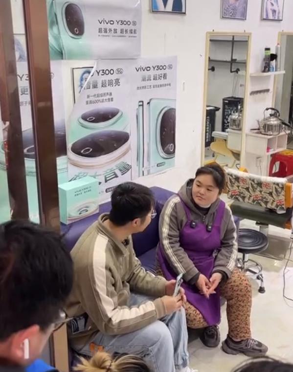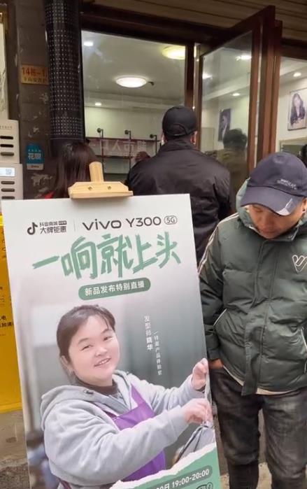 理发店门口也放好了广告牌,屋子里也都贴满了手机的广告,没想到这间理发店竟成了直播带货热门场所。