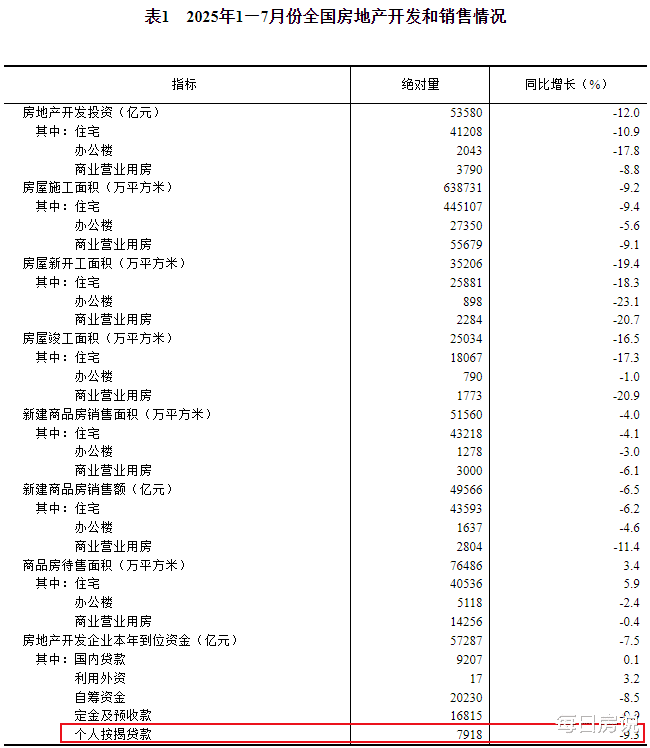 据国家统计局,今年前7月个人按揭贷款7918亿元,同比下降9.3%。
