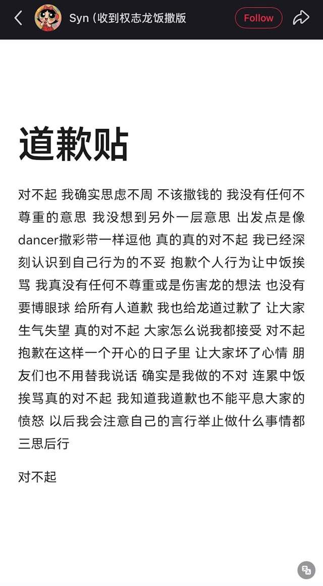 事件发酵后,这名丢假钞的粉丝在社交平台发文道歉,表示原本只是想逗GD开心,没料到惹出这么大风波。她也替所有中国粉丝抱歉,希望接下来的演唱会能平稳无事。